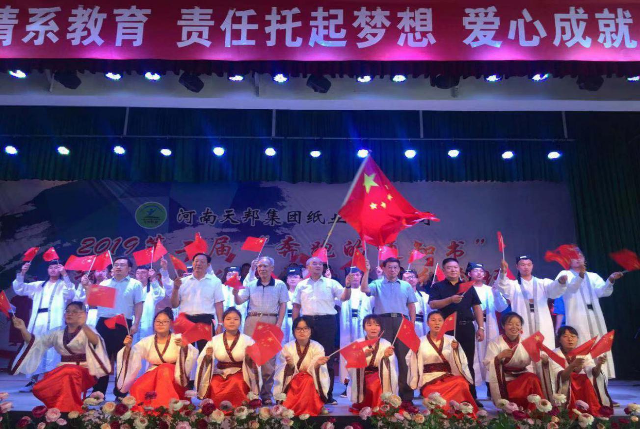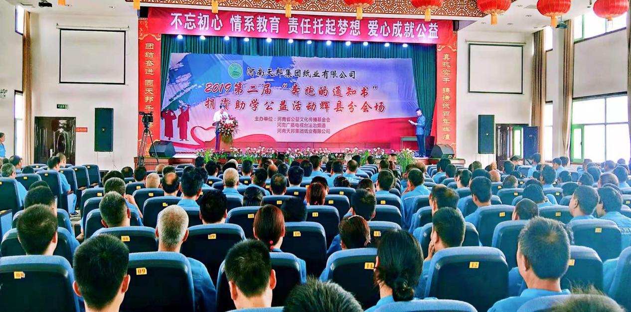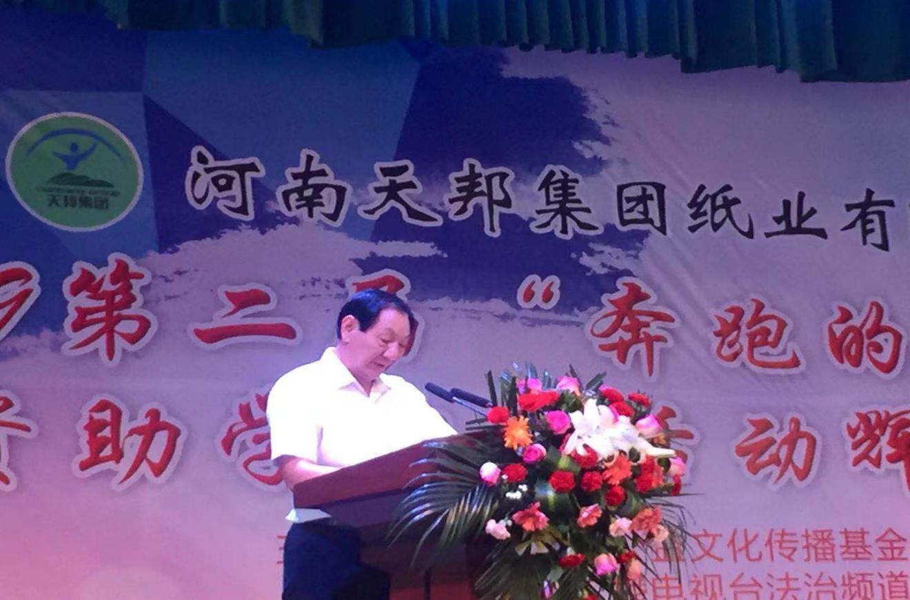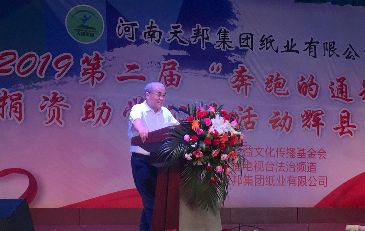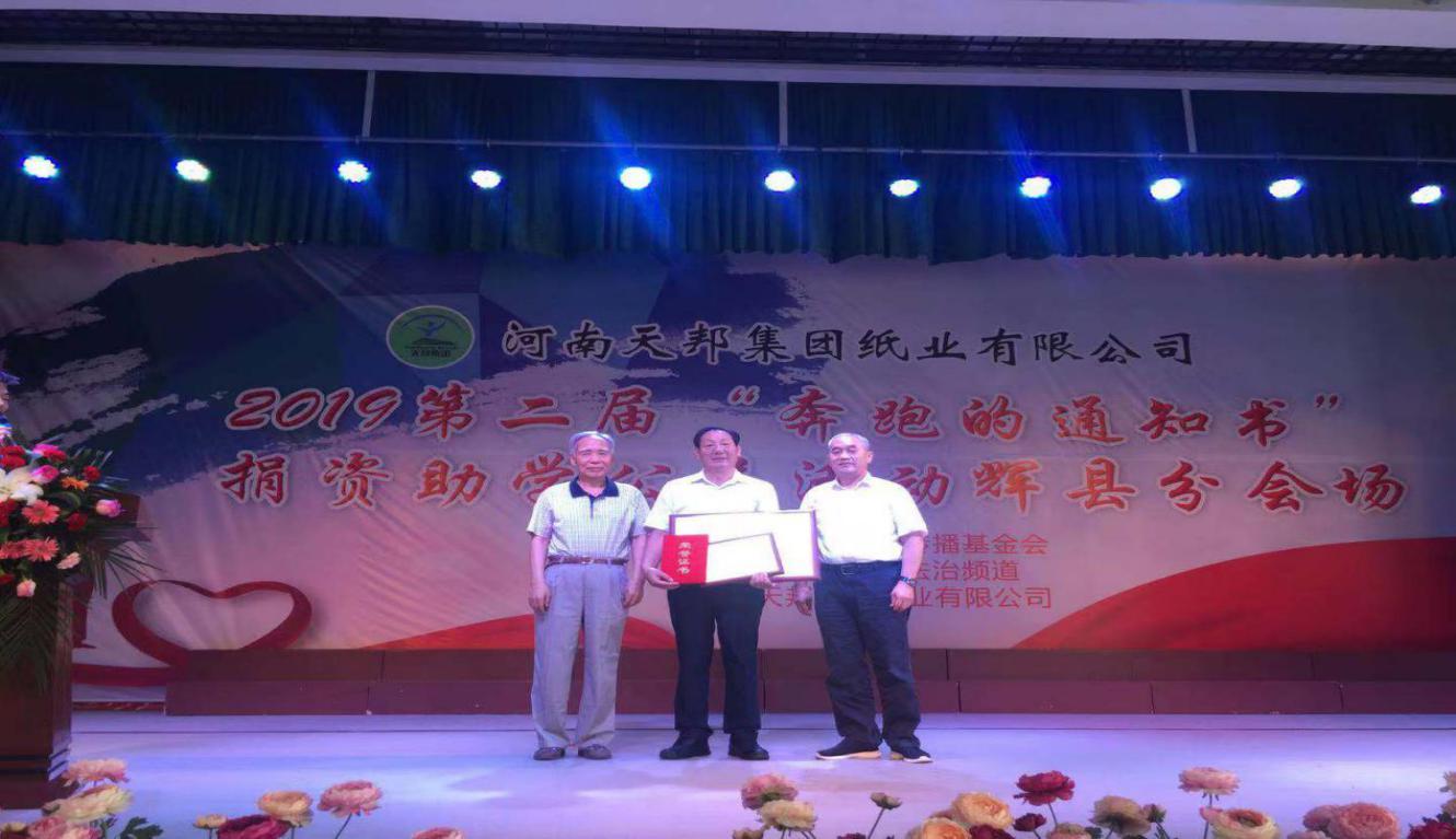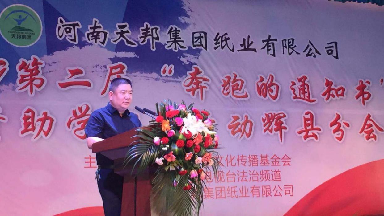 为贫困家庭点燃希望,为困难学生放飞梦想。8月23日上午, 由河南省公益文化传播基金会、河南广播电视台法治频道联合河南天邦集团纸业有限公司共同主办的“2019第二届奔跑的通知书捐资助学公益活动辉县分会场”在河南天邦集团纸业有限公司(以下简称天邦集团)举行。河南省政协原副主席郭国三,河南省委办公厅原副主任赵德山,河南省人大环资委原副主任马恒心,河南省公益文化传播基金会理事长罗延峰,河南省辉县市市委常委、宣传部部长宋建杰,河南天邦集团纸业有限公司董事长范乃旺等领导出席本次活动。