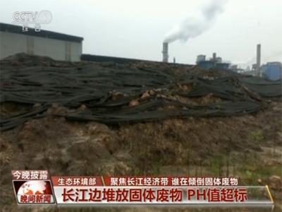 生态环境部环境监察局副局长 闫景军:其中大概有两千吨,碱性比较强,旁边的水坑它的pH值是达到了11点多,是呈比较强的碱性。我们对重金属含量进行了检测,发现重金属镍在水里边的含量超过了排放标准的0.47倍,这个(堆放点)距江边的距离大概只有两三百米,遇到大雨会对长江造成比较大的风险。