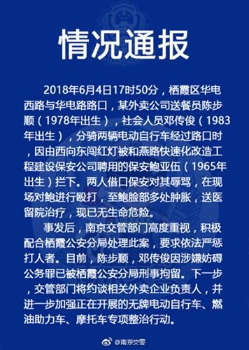 【真相】6月6日,南京交警官方微博发布通告称,某外卖公司送餐员陈某和社会人员邓某分骑两辆电动车经过路口时,因由西向东闯红灯被保安鲍某拦下,两人借口对鲍某进行辱骂并殴打,至鲍某脸部多处肿胀,送医留院治疗,现已无生命危险。事发后,陈某和邓某因涉嫌妨害公务罪被刑事拘留。
