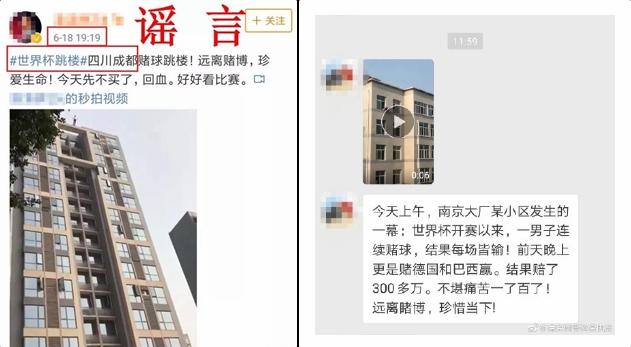 【传闻】6月17日到19日,海南琼海、四川成都、江苏南京等地微博、微信群、朋友圈流传着不同版本“世界杯赌球输钱跳楼”的视频和文字消息,视频内容是不同的“跳楼自杀现场”,配发的文字是“某地一男子赌球跳楼”“一男子连续赌球赔了300多万一了百了”等内容。