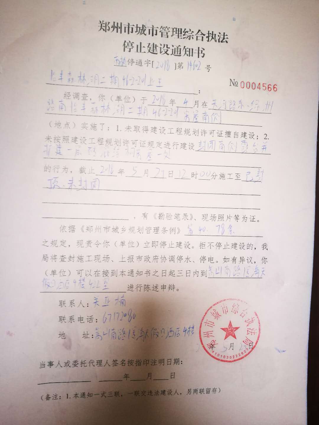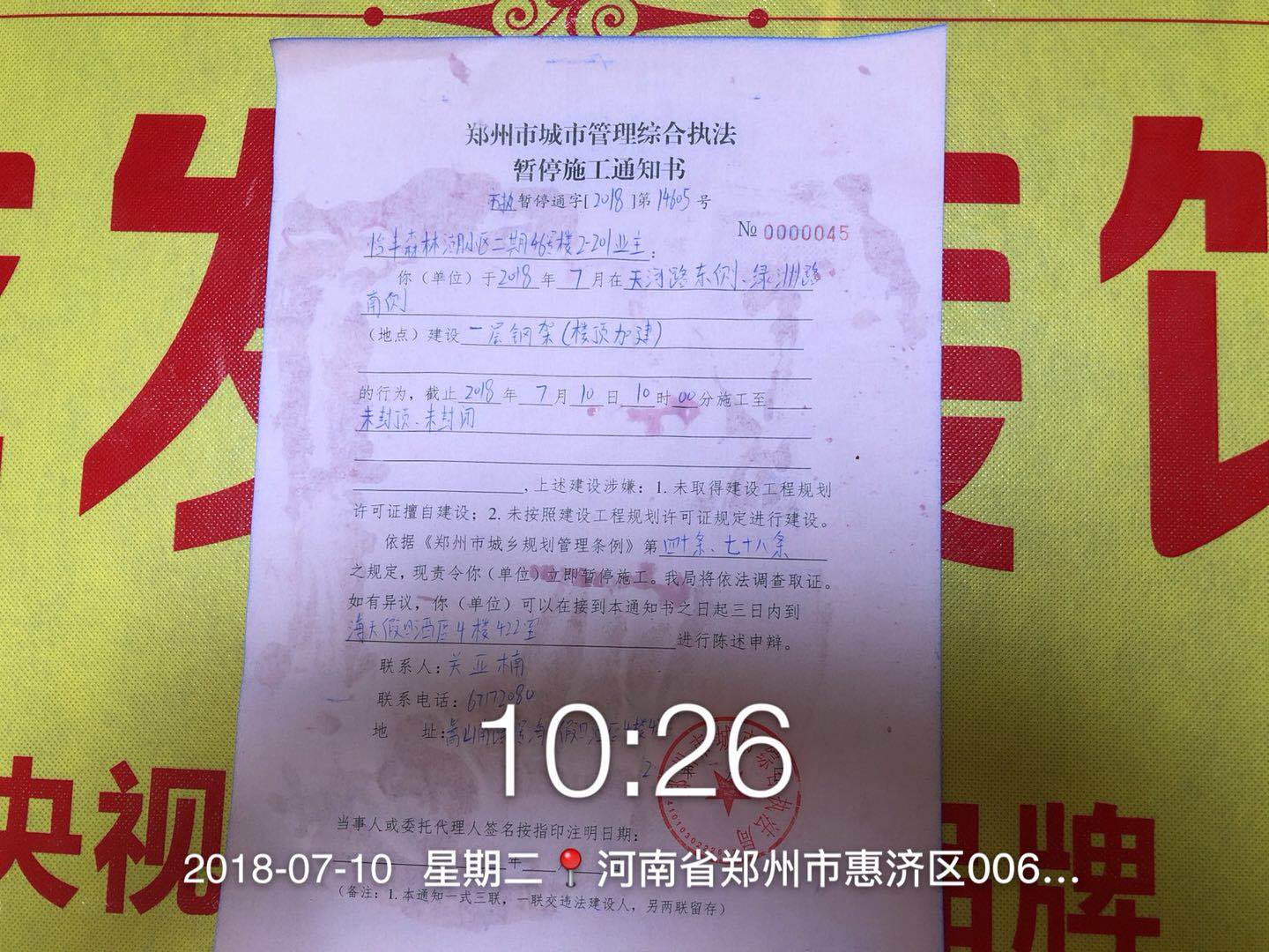 在此前的采访中,惠济区执法局的工作人员告诉记者,该局已于5月29日向加盖业主下达了《停止建设通知书》和《自行拆除通知书》,该处加盖建筑“未按照建筑工程规划许可证规定进行建设,封闭南侧露台,并扩建一层砖瓦结构房屋一处”,根据《郑州市城乡规划管理条例》底40条、第78条之规定,责令其立即停止建设,自行拆除上述违法建筑。