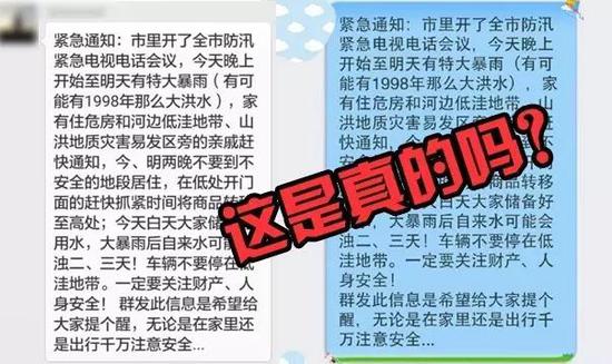 该消息称:“紧急通知:市里开了全市防汛紧急电视电话会议,今天晚上开始至明天有特大暴雨(有可能有1998年那么大洪水)……一定要关注财产、人身安全!群发此信息是希望给大家提个醒,无论是在家里还是出行千万注意安全……”