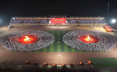 随后举行的“薪火跨年”篝火晚会将活动推向新的高潮。师生齐聚体育场,篝火点燃的瞬间,一面长50米的巨幅国旗徐徐展开,全场师生齐声高唱《我和我的祖国》,激昂的歌声将活动气氛推向顶点。热烈的篝火旁,师生手拉手载歌载舞,笑声、欢呼声与音乐交织回荡,营造出温馨且充满活力的跨年氛围,让学生在紧张学习之余充分放松身心,深切感受集体的温暖。