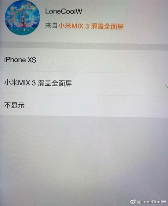 同时曝出的还有小米MIX 3的微博小尾巴,被设置为“小米MIX 3滑盖全面屏”。