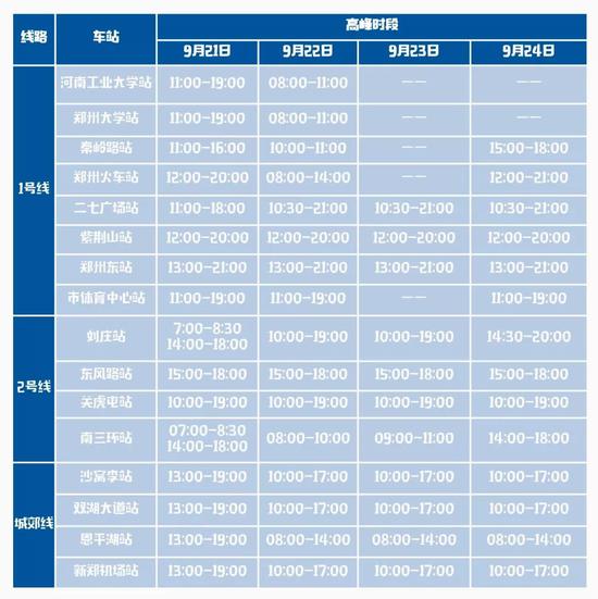 周五及节前时刻表较其他两种时刻表而言,将根据高峰时段提前的客流特点,提前增加发车密度,晚高峰在17:30、18:10各增加一列空车至紫荆山站载客,保障乘客顺畅出行。