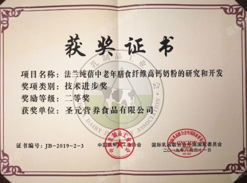 除了深耕婴幼儿奶粉市场,圣元在成人奶粉领域也颇有建树。此次获得技术进步奖的法兰纯蓓中老年膳食纤维高钙奶粉,采用了钙膳专业配方,在配方中强化了膳食纤维,助力肠胃蠕动,清除体内垃圾。法兰纯蓓中老年膳食纤维高钙奶粉还在配方中添加了钙铁锌组合,每天2杯,即可满足成人推荐钙摄入量的50%,让爸妈身体轻盈健康。