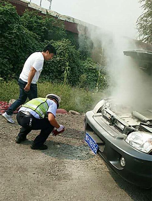 9月12日,焦作市博爱县一辆小轿车在武陟县境内突然自燃,司机吓得不知所措,抓起路边的土直往车上撒,危急关头,执勤的武陟交警紧急伸出援手及时将火扑灭,为车主减少了财产损失。