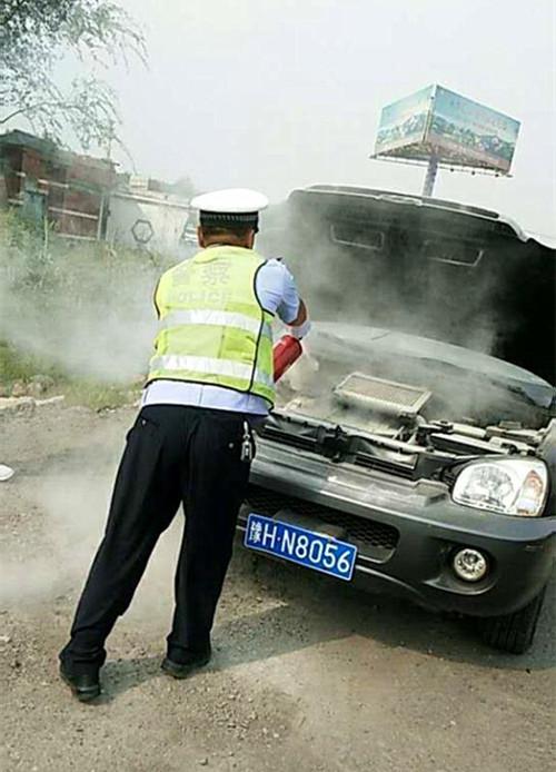 当日9时许,327国道与焦作塔南路交叉口东侧100米处,一辆由西向东行驶、牌照为豫HN80XX的黑色“现代”越野车突然紧急靠边停车,司机冲出驾驶室打开引擎盖一看,只见发动机一侧冒出一股青烟,伴随着一阵啪啪声响,紧接着一股火苗腾地窜出,险些烧到毛发。司机惊慌失措,抓起路边的土往车上猛撒。在不远处执勤的武陟县公安局交警大队四中队辅警王继超、杨国胜看到后急忙跑来,一边报警,一边设法施救。在三阳转盘执勤的辅警队员刘光明、李才听到对讲机呼叫也随后赶来,加入救援行列。四名辅警队员分头行动,两人负责指挥疏导交通不让其他车辆、行人和非机动车靠近,两人从过往大货车上借来大型灭火器对着火源就是一阵喷射,经过5分钟的奋战终于将火扑灭。