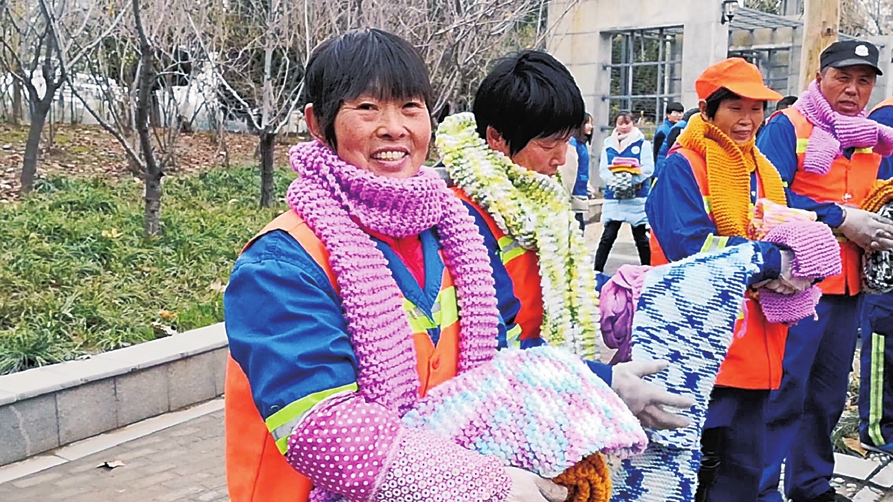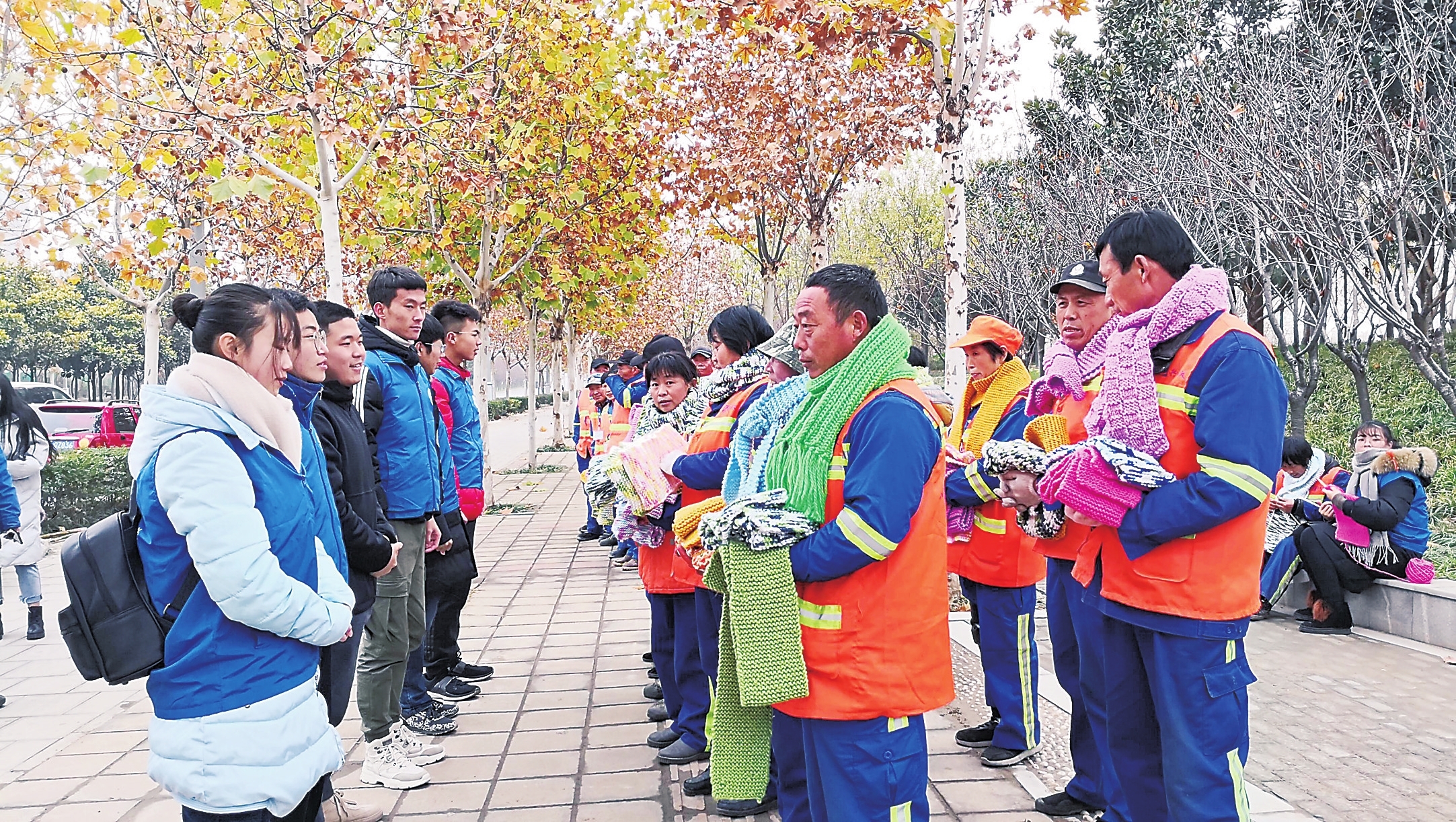 本报讯郑州气温骤降,但环卫工们依然坚守在自己的岗位上。为了感谢这些城市美容师,一些爱心大学生利用业余时间编织出300条毛线围巾送给他们。