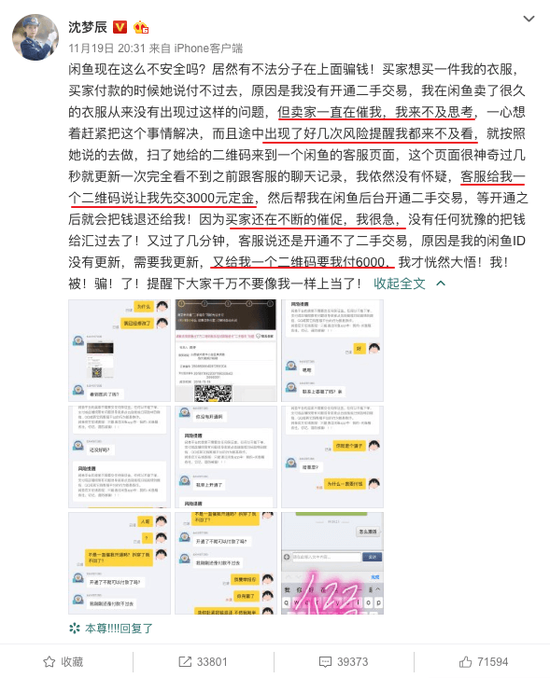 原来,沈梦辰一直在闲鱼上出售自己的二手物品。在他发的这条微博中称,买家在拍下了她的二手物品后称由于其未开通‘二手交易’而无法付款,并给了沈梦辰一个二维码让其前往开通,在开通过程一个自称‘闲鱼客服’的人分别向沈梦辰索取 3000、6000 元定金。