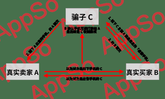 这种骗局一般常见于数码产品等价值较高的二手物品。我们先假设 A 为真实卖家,B 为真实买家,C 为骗子。