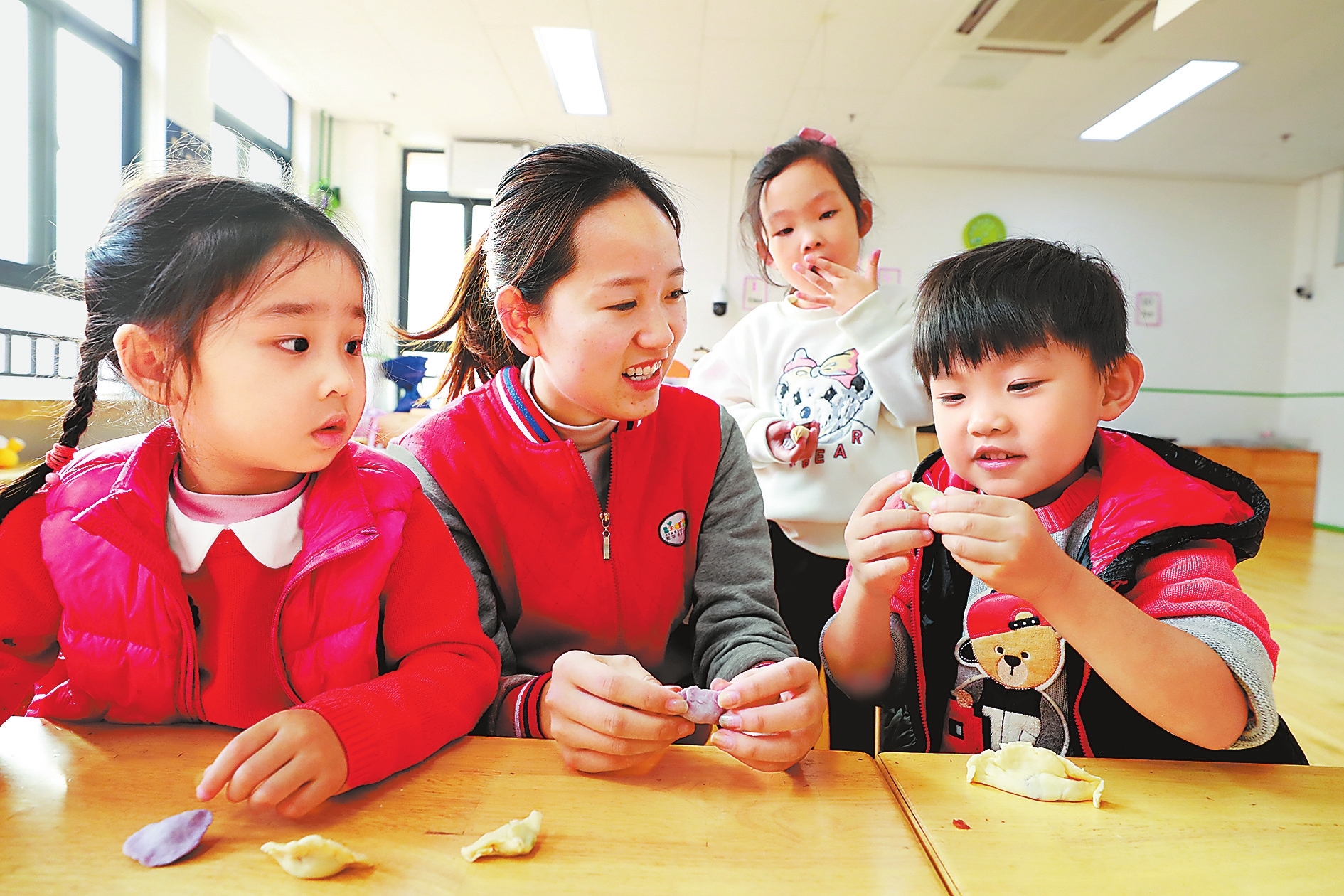 12月21日,郑州市郑东新区新华书童幼儿园开展“包饺子知民俗迎冬至”主题活动,孩子们在家长和老师的带领下学习包饺子,感受传统文化。本报记者聂冬晗摄