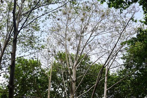王建勇说,“鸟粪含有碱性和盐分,‘火力十足’。鸟粪覆盖在树叶面上,会影响其光合作用,时间一长,影响树木生长,直至死亡。其实几年前,我们就发现这个问题了,也曾经在挽救它,用高压水枪冲刷过,但无奈,树上鸟窝太多,鸟粪倾泻而下,往往今天冲刷干净,第二天,又落满了粪便。”