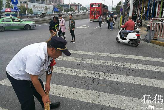 由于马路当中到处是玻璃碴,来往车辆和行人更是躲躲闪闪,给本就不宽的道路制造着安全隐患。事发现场,当两辆公交车已靠边停车等候处理的过程中,正在路口协助“路长”执勤的解放路巡防队员王成贤和队友闻讯后,迅速找来扫帚,将满地的碎玻璃进行了及时清理,道路交通很快恢复了秩序。
