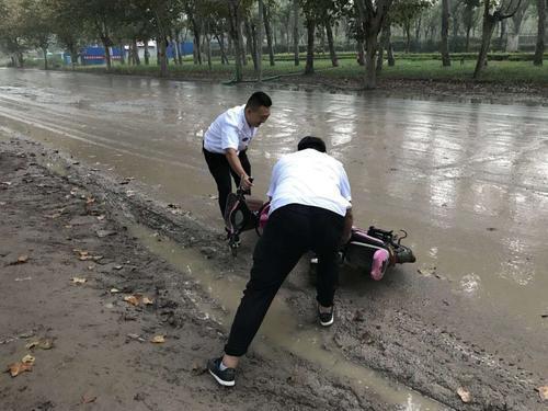 巡防队员赶紧把电动车扶到路边,以免事故发生。