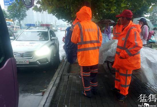 郑州环卫工街头冒雨扫街 大巴车却扔下垃圾
