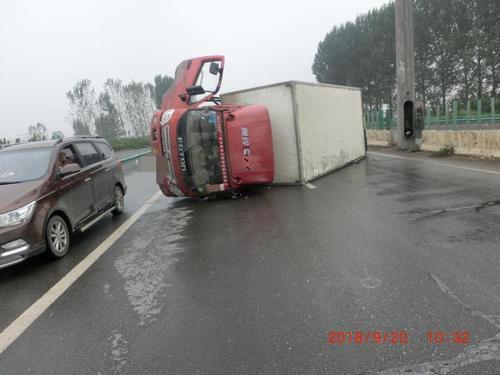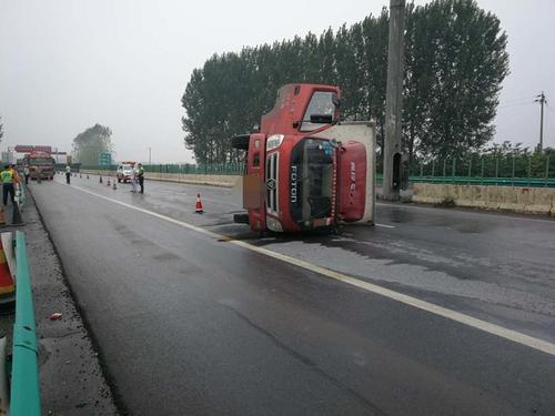 郑州:雨天货车高速侧翻 差点把旁边小车压到车下