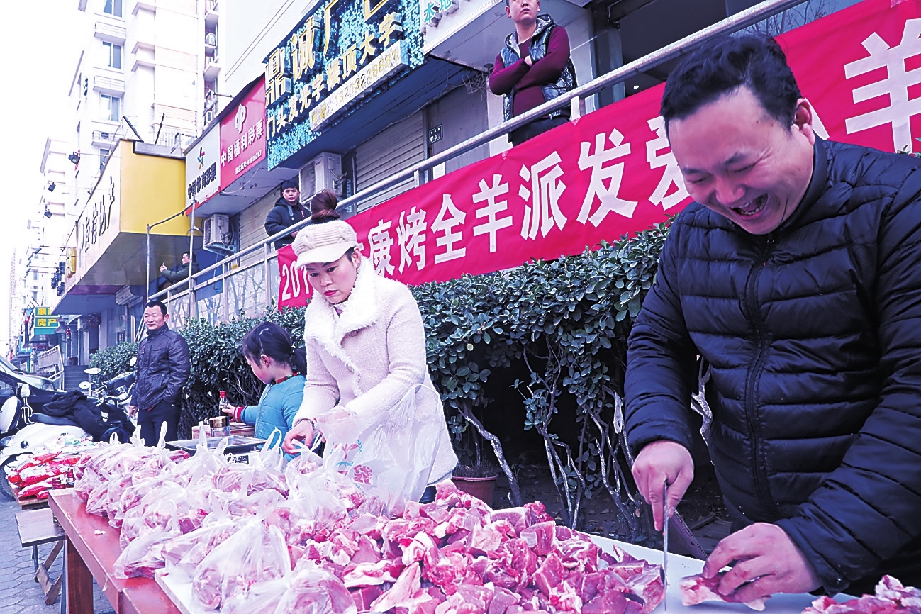 元旦这一天,在郑州市区丰庆路与国基路交叉口一家名为太康羊肉店的小店内,早早聚集了一群残疾人和环卫工,而旁边店主孙合理正忙着把六只羊往门口的桌子上搬,妻子、女儿也在一旁帮忙。