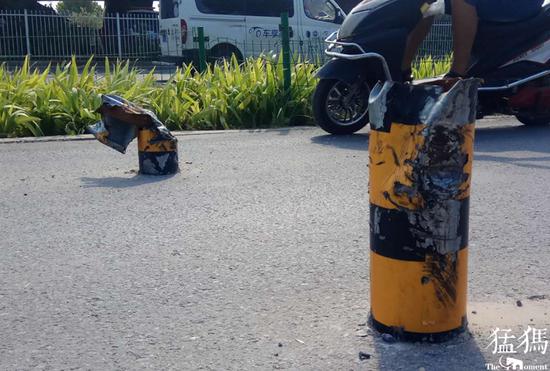 一个个由钢管制成的桩子,轻的被撞弯变形,重的被撞裂撕开,一个个如同“刀片”一样伸在距离地面二三十公分的位置,很是吓人。
