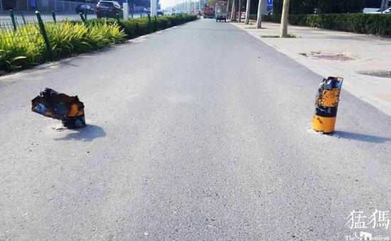 郑州隔离桩被撞后变身锋利"刀片" 骑车路过要当心