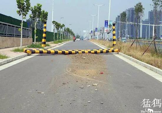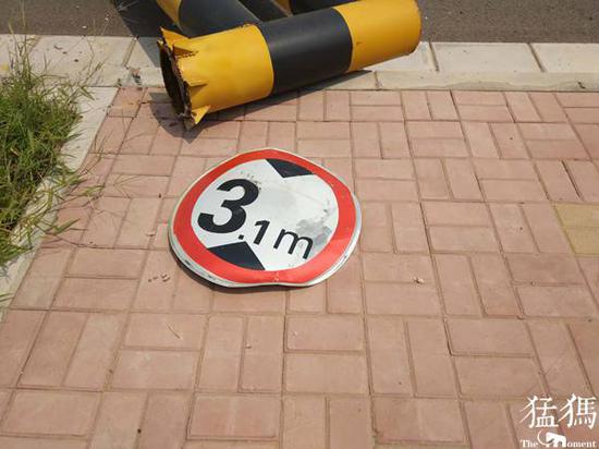 现场,被撞倒的限高杆下散落着建筑垃圾和部分汽车碎片,限高杆上有明显的撞击痕迹。由于道路被限高杆堵死,沿途行人及车辆只能绕行快车道通过。