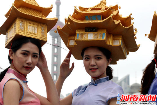 河南洛阳上海推介旅游美女头顶“古建筑”亮相