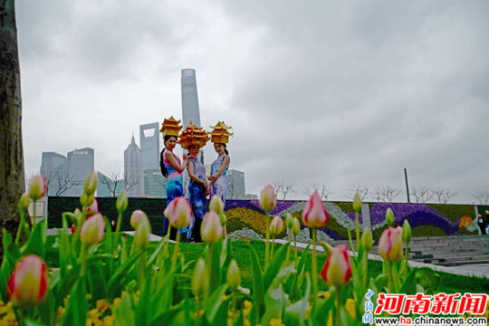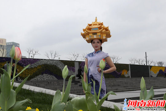 河南洛阳上海推广旅游 当地美女头顶“古建筑”亮相